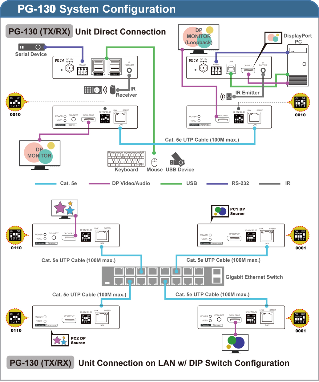 PG-130 is a KVM Extender designed to deliver DisplayPort-enabled computer signals over long distance. It is an IP-based extender working in pairs to extend various signals, such as DP(video/audio), keyboard, mouse, USB, RS-232, and IR. Both of the transmitter unit (TX) and receiver unit (RX) are connected via one CAT.X cable to deliver PC singals up to 100m (point to point). It means that the user can remotely access and control the connected DisplayPort-enabled computer away from the local site.